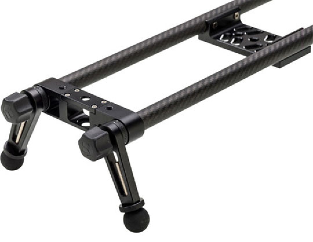 The slider features 18mm diameter carbon fiber rails and supports a total payload of up to 17.6 pounds. The slider can be mounted on a tripod or stands, or placed on a level surface. The built-in bubble level enables you to confirm that your slider is level. Each leg mounts onto the slider track ends via a rosette and can rotate throughout 360°, and each foot has approximately 4" of height adjustment for leveling. You can operate the slider on any angle from 0 to 90°, and you can even undersling the slider.