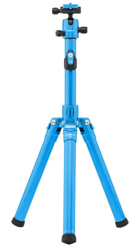 The blue GlobeTrotter Air Travel Tripod from MeFoto is a sturdy, lightweight, and compact aluminum-alloy support designed for the modern enthusiast and smartphone photographer.