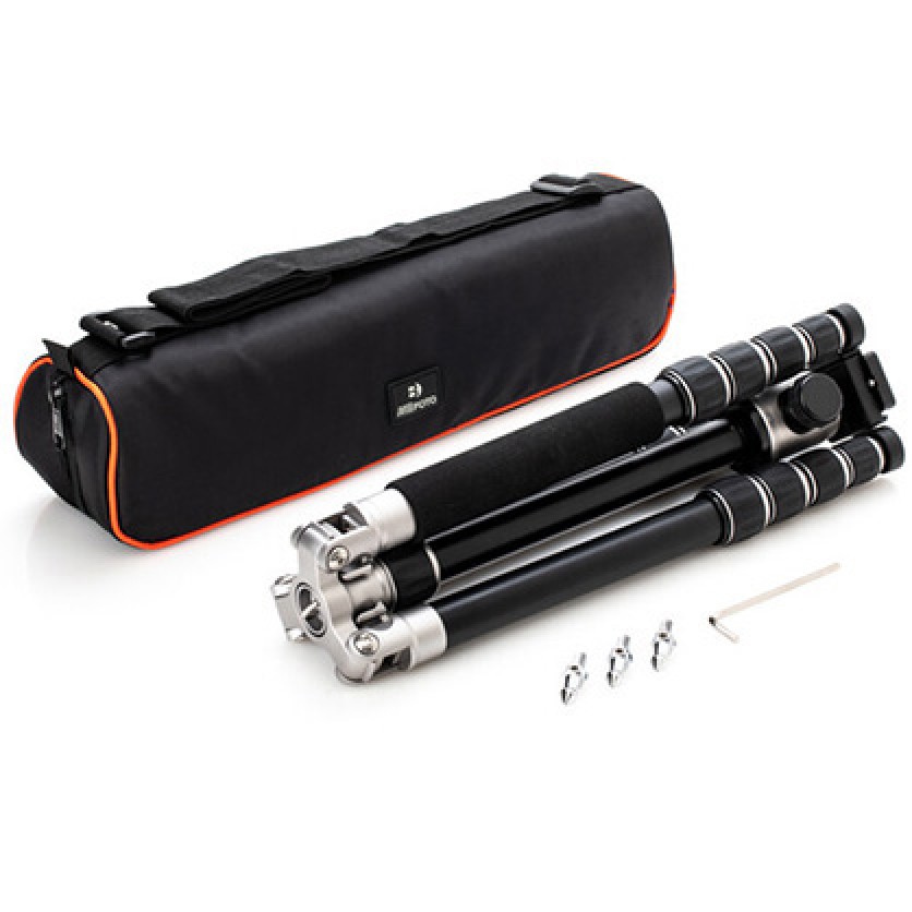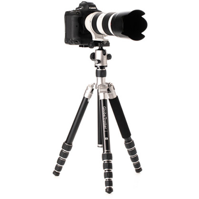 The MeFoto Globetrotter Aluminum Travel Tripod Kit from Benro is a sturdy, compact tripod that extends to 64.2", supports up to 26.4 lb, and folds down to just over 16". The GlobeTrotter is actually two camera supports in one: a foam-cushioned, removable leg attaches to the center column to convert to full size monopod.