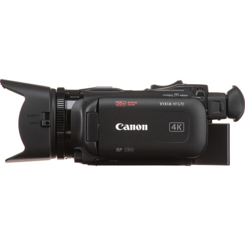 Record high-resolution 4K video with the compact, black Canon Vixia HF G70 4K Camcorder. The G70 features the same form factor and many of the great specs of the G50, including a 1/2.3" UHD 4K CMOS sensor, a DIGIC DV 6 image processor, an 8-blade circular aperture, 5-axis image stabilization, a 20x optical zoom in 4K, and recording up to UHD 4K30 resolution. This streamlined model features a larger 3.5mm LCD capacitive touchscreen display, a higher resolution tiltable 0.36" OLED EVF, recording only in MP4 format, and fast USB Type-C video-only output with UVC support for live streaming to a computer.