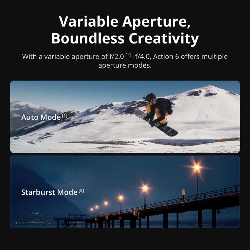 The Osmo Action 6 is DJI's first action camera with a variable aperture of f/2 to f/4, breaking away from the traditional fixed-aperture design. The aperture adjusts manually or automatically within each range to achieve clear and balanced results, from low-light night shots to detailed landscapes.