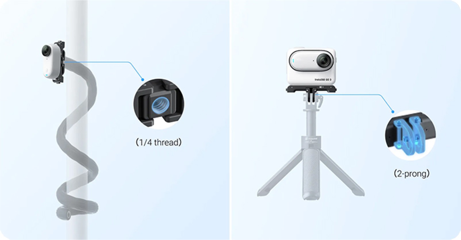- Switch between a 1/4 screw and 2-prong mount for use with different accessories.