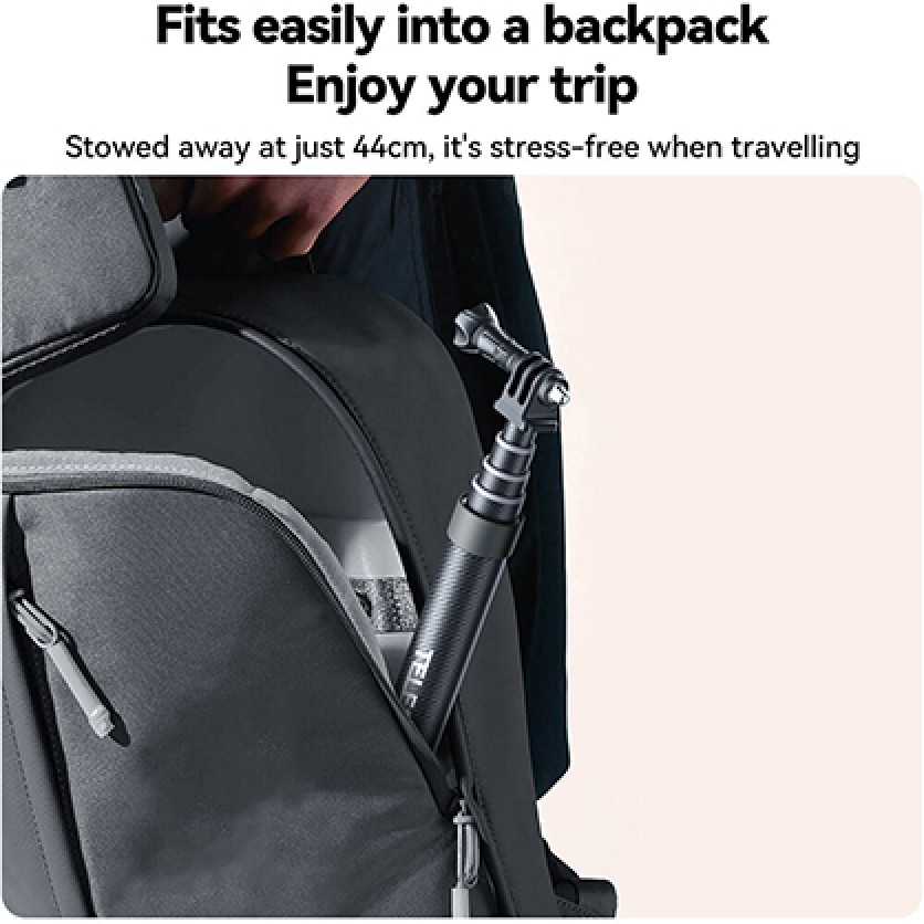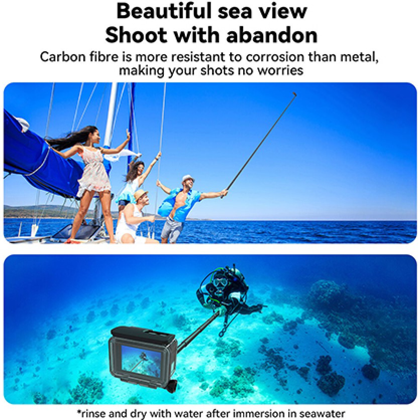 This ultralight carbon-fibre selfie stick is perfect for capturing wide views and selfies with your action camera. It's highly portable, extending from 17 to 118 inches, while remaining lightweight and durable. The stick is compatible with GoPro and other action cameras up to 10.6 ounces, featuring both a 3-prong and a 1/4"-20 screw mount for flexibility. Its comfortable silicone grip and easy twist-lock mechanism make it user-friendly for any adventure.
