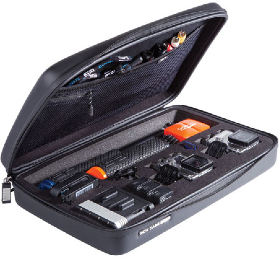 The large black SP-Gadgets POV Case for GoPro Cameras is a semi-rigid clamshell case that holds a GoPro HERO camera and accessories. It features a pre-cut foam interior designed to simply organization and to keep your gear secure. The camera compartment will fit the GoPro HERO in its housing with the LCD BacPac attached, and provides slots that can accommodate mounts, additional batteries, memory cards, cables as well as many other action cam-related accessories you may want to bring along.