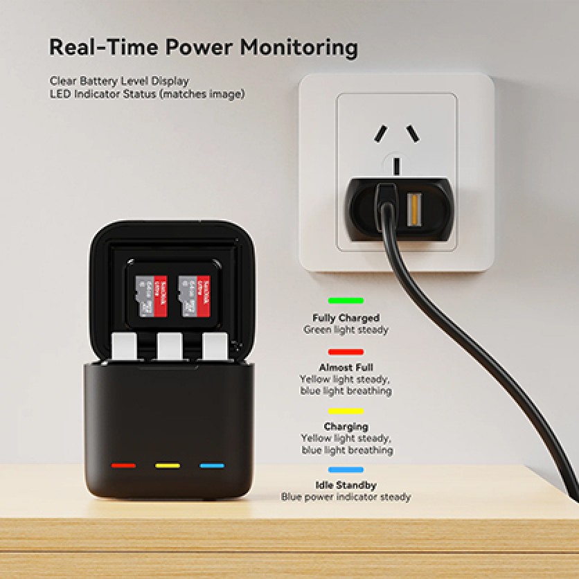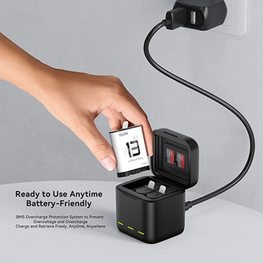 This sleek charging box features a retractable storage design that neatly houses up to three GoPro batteries and two microSD cards, while also functioning as a high-speed charger. Whether you're travelling, shooting on location, or storing your gear at home, it keeps everything secure, charged, and ready to go.