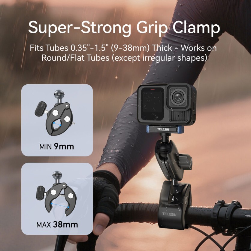 Designed for cyclists and athletes, this Universal Tube Clamp Mount from TELESIN allows you to attach a GoPro HERO13 Black camera onto the handlebar of a bicycle or any other rod with a diameter between 0.4" and 1.5". Attaching to the HERO13 via its advanced magnetic mount with anti-twist locating pins, this mount features two ball heads for 360° adjustment, allowing for infinite camera angles and creative shot composition. With its all-aluminum construction and tactile locking knobs, this mount provides a sturdy hold while remaining lightweight at just 5.5 oz.