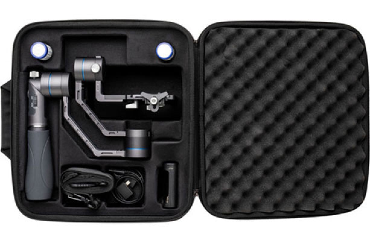 This stabilizer runs on two included 3200mAh lithium-ion batteries which provide up to a 12-hour runtime. A charger, USB cable, lens support adapter, Panasonic and Sony camera cables, and a carrying case are included with the stabilizer.