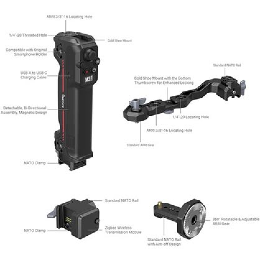 The grip features multiple 1/4"-20 and 3/8"-16 ARRI-style accessory threads, as well as shoe mounts for mounting additional accessories such as an extension arm, a smartphone holder, a light, or a monitor. The handgrip has a maximum load capacity of 17.6 lb and features a soft silicone grip for comfort and a solid hold. The wireless receiver can be used with the SmallRig sling handgrip, dual handgrip, or handheld ring with magnet attachment.