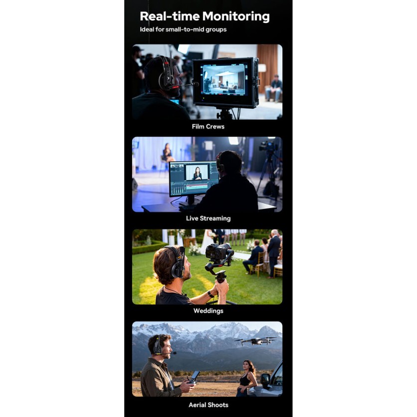 This full-duplex wireless intercom system offers effortless, hands-free communication for teams, ideal for film crews, live streaming, and events. It supports real-time conversations with ultralow latency and environmental noise cancellation, ensuring clear audio even in noisy settings. The lightweight design provides comfort, while the long battery life and charging case enhance usability. Flexibility is key, with multiple communication modes and the ability to switch to wired communication if needed, making it versatile for various scenarios.