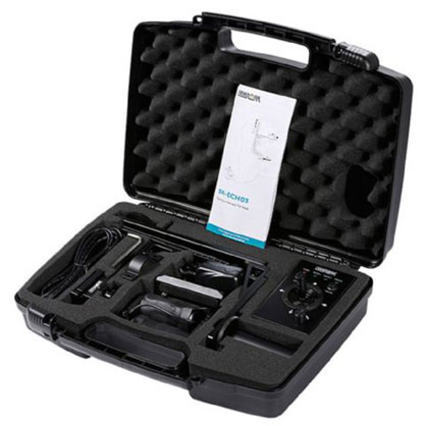 The joystick control gives the head precision pan and tilt movement in either direction from a slow crawl up to the required speed. The joystick will also pan and tilt simultaneously. On the side of the control box is a variable speed controller, so you can set the maximum speed for better control, there are also switches to change the direction of the joystick control and an on- and off switch. On the front of the control box are sockets for the control cables, 12V DC in and two motor sockets. The head is powered by the supplied AC adaptor. At the optional accessories you can find a accu pack and Battery Holder for the Sevenoak Panoramic Head SK_ECH03, in order to use it without the adapter. On the bottom of the control box is a mounting bracket to attach it to the Jibs and Cranes. The SK-ECH03 comes in a handy case.