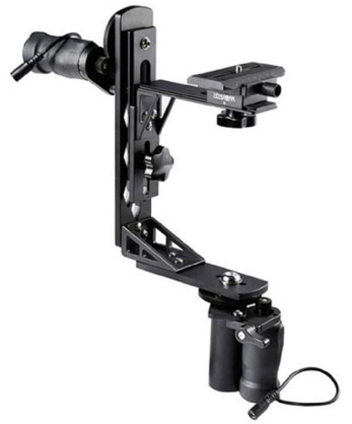 This electronic pan and tilt head offers smooth, precise camera movements with its remote-controlled joystick, allowing for 360-degree pan and tilt. It supports cameras up to 5 kg and is compatible with tripods, sliders, and jib arms. The adjustable speed settings and motor disengagement feature ensure precise control and easy camera balancing. Powered by an AC adaptor, it also offers optional battery use. The kit includes a control box, motors, cables, and a mounting bracket, all in a convenient case.