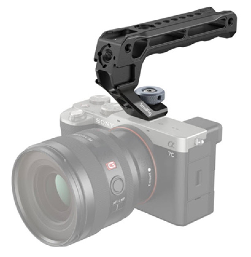 SmallRig Top Handle with Cold Shoe 3764 is designed to facilitate low-angle shot and reduce burdens on arms. The ergonomic handle, featuring anti-slip and anti-freeze silicone, feels comfortable and weighs only 129g because of a hollowed-out structure. It has 3 front cold shoes and 2 rear cold shoes that allow simultaneously mounting microphone, LED light, monitor, and other accessories.